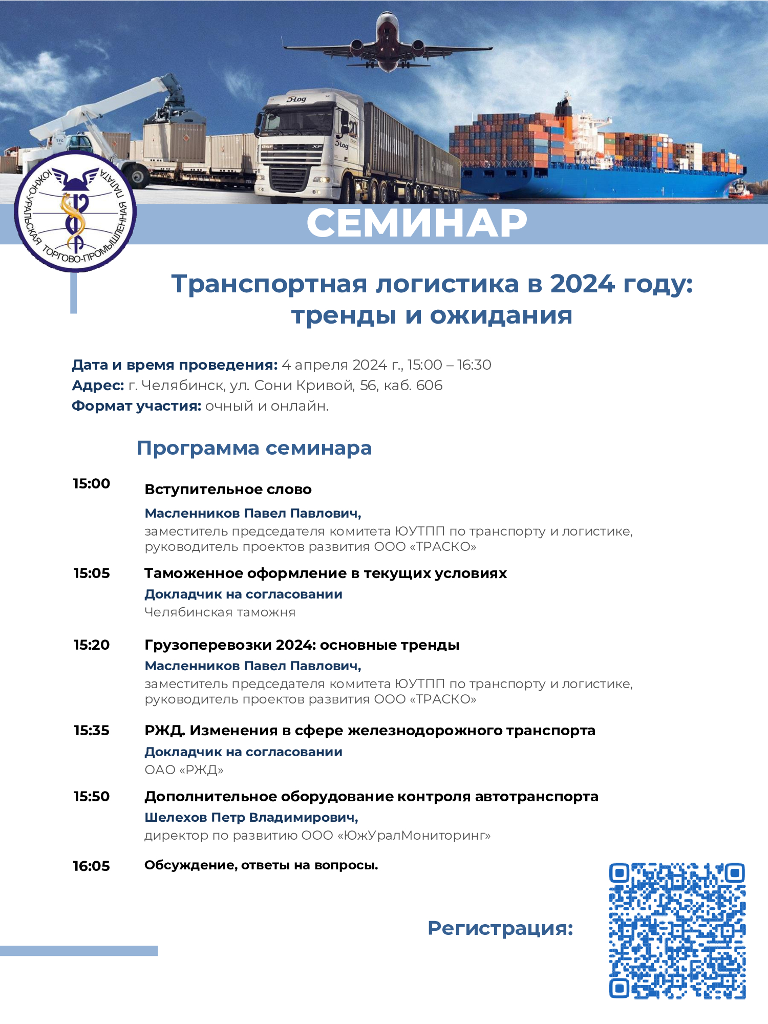 4 апреля 2024 года в 15:00 Комитет ЮУТПП по транспорту и логистике проведет бесплатный семинар для предпринимательского сообщества «Транспортная логистика в 2024 году: тренды и ожидания».