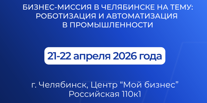 21 и 22 апреля 2026 года Межрегиональным союзом «Клуб молодых промышленников» планируется проведение межрегиональной бизнес-миссии на тему: роботизации и автоматизации в промышленности. Место проведения: г. Челябинск, ул. Российская 110к1 (Центр «Мой бизнес»).