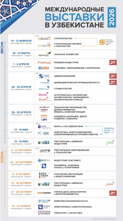 Календарь выставочно-ярмарочных мероприятий 2026 в Узбекистане